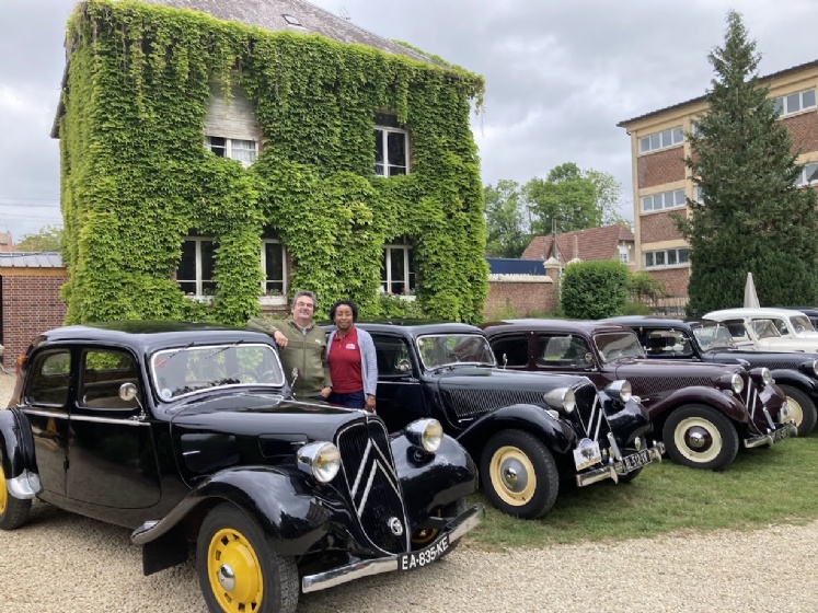 Les Traction au musée d'histoire locale du Vermandois, et les organisateurs Yolande et Bruno Bertrand.