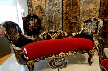 Ensuite, rendez-vous à l’Hôtel de la Monnaie où notre guide nous dit tout sur la fabrication d’objets en papier mâché à Pont-à-Mousson. Ouvert en 1999, le Musée « Au fil du papier » permet une immersion au cœur d’une industrie qui a marqué l’histoire du territoire lors de la fin du 19e et début du 20e siècles grâce à la famille allemande Adt, francophile, qui s’installa en Meurthe et Moselle suite à l’Annexion de 1870 pour des raisons de commodité. Nous admirons le magnifique « Salon de la Reine Victoria » acquis par la ville en 1995. Pour les grandes pièces, nous apprenons que l’armature est en bois et que seules les décorations sont en papier mâché. Plateaux pour fumeurs, coupelles, boîtes à thé, plumiers, ronds de serviette, vases … mais aussi un magnifique guéridon avec, pour décor, la cathédrale de Metz. Des objets élégants et raffinés inspirés des décors asiatiques.
