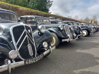 Le thème retenu était bien évidemment les 90 ans de la Traction. Le plateau se composait de deux 11 BL 38 dont une en cours de restauration, une 7 C de 1935, l’authentique 11 BL de 38 camouflée, une 11 B de 1955 ayant appartenant au grand-père d’un membre du club, et, sur le carrousel, une 15 six cabriolet (base de berline de 1949).