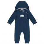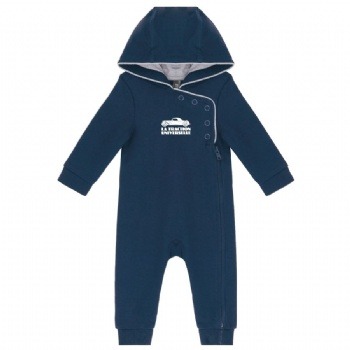 85% coton / 15% viscose pour tissu Oxford Grey, 100% coton pour tissu Navy. Molleton non gratté. Ouverture sur le devant avec zip et boutons pression. Intérieur de capuche contrasté. Bas de manches et de jambes en bord-côte.